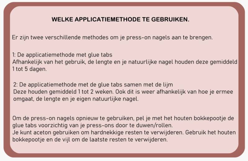 Ook is het goed om de press-on nagels aan te brengen voordat je naar bed gaat, zo kunnen de nagels beter hechten omdat je niet in water komt en je niets met je nagels doet.